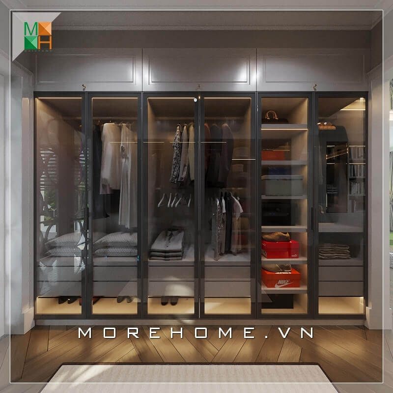 Mẫu tủ quần áo cao cấp sử dụng kính trong suốt thuận lợi cho việc lựa chọn cũng tôn lên sự sang trọng, tinh tế dành cho không gian biệt thự, nhà phố hay chung cư cao cấp.