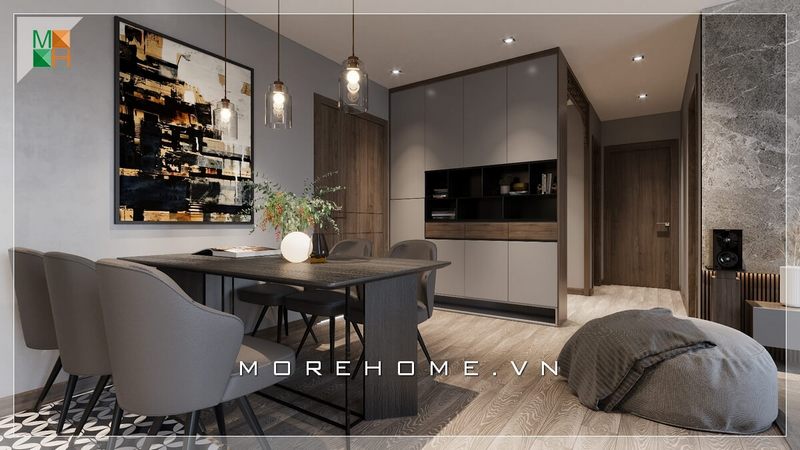 Phòng ăn chung cư nhỏ được bố trí thiết kế hiện đại cho những phút giây quây quần thêm thoải mái, tiện nghi.
