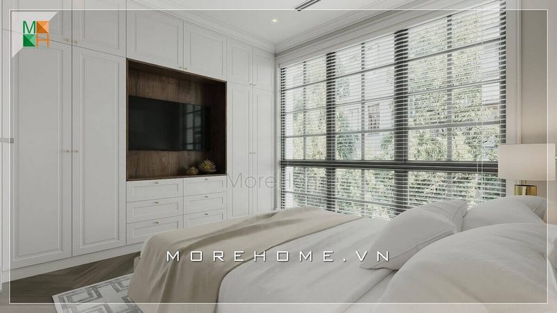Thiết kế nội thất phòng ngủ hiện đại cho căn hộ chung cư cao cấp sử dụng màu trắng thống nhất trẻ trung và cao cấp.