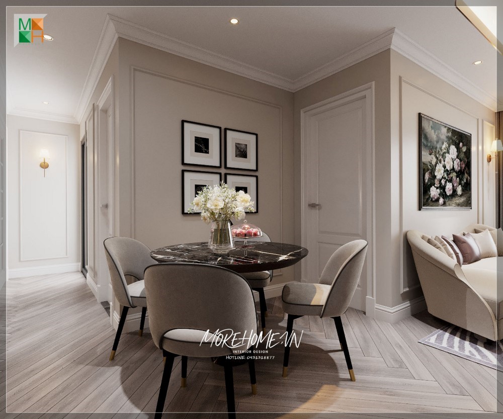 Trang trí nội thất phòng ngủ Master chung cư để tạo nên sự ấn tượng, sử dụng gam màu trắng làm chủ đạo kết hợp với sàn gỗ nâu trầm để tạo nên cảm giác ấm áp và gần gũi hơn.