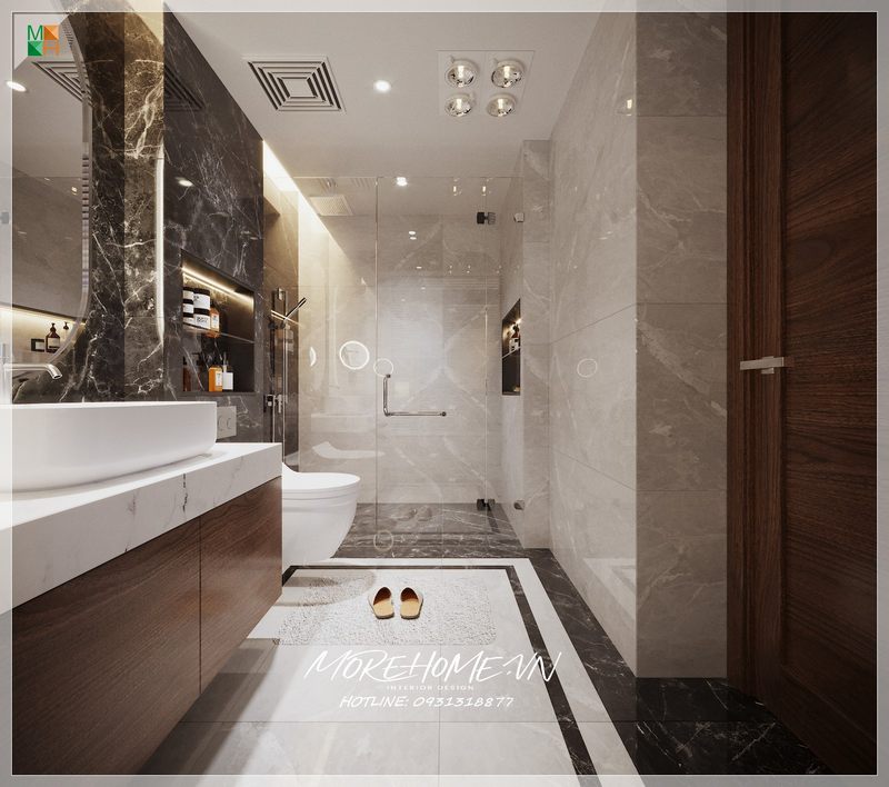 Sử dụng gạch ốp tường và gạch lát nền sang trọng và hiện đại để thiết kế nội thất phòng tắm và WC của nhà phố thông minh.