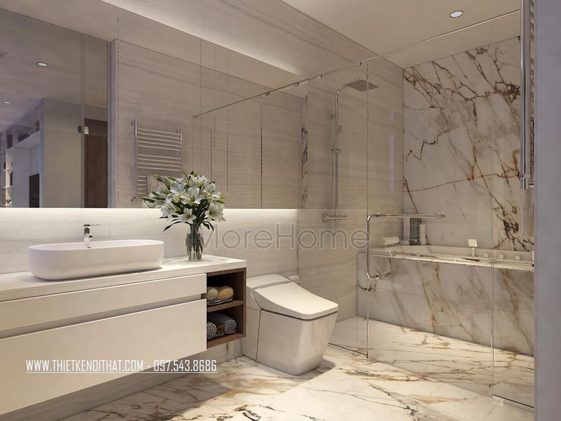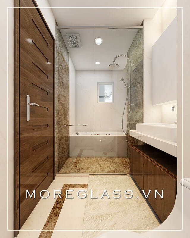 Cửa kính phòng tắm hiện đại, sử dụng kính cường lực cao cấp giúp phân chia hai khu tắm và tủ kệ lavabo mang vẻ đẹp sang trọng, lôi cuốn.