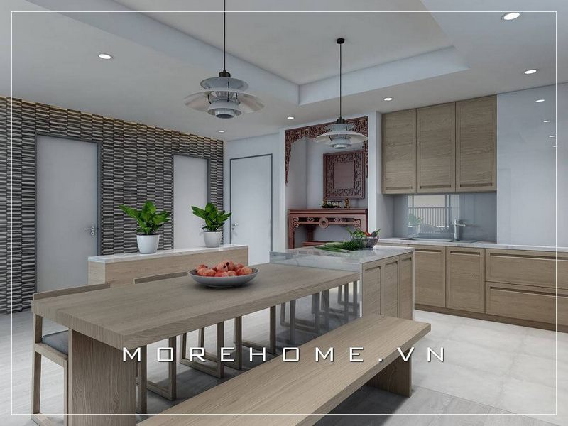 Góc nội thất với tủ bếp gỗ tự nhiên ấm áp
