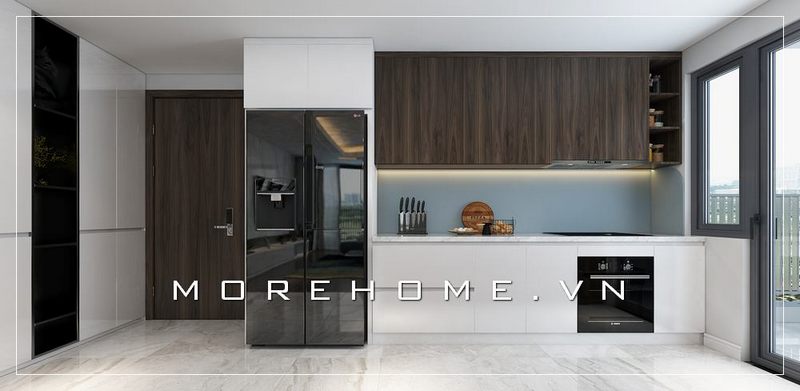 Mẫu tủ bếp có màu nâu trầm - trắng tự nhiên góp phần tạo nên sự ấn tượng và tiện nghi cho người nội trợ.