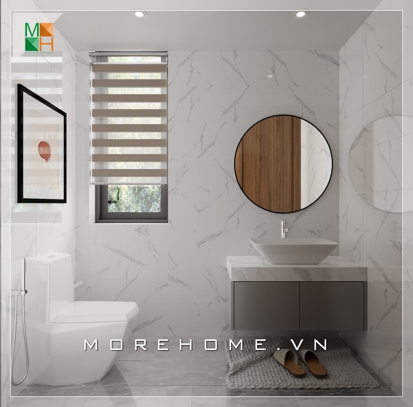 Thiết kế nội thất phòng tắm và WC nhà phố thông minh khi sử dụng gạch ốp tường và gạch lát nền sang trọng và hiện đại.