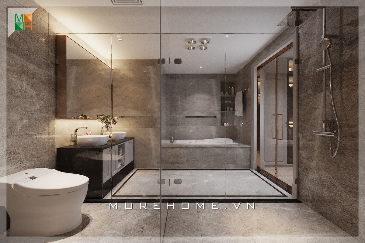 Vách kính cường lực ngăn cách trong không gian phòng tắm hiện đại của biệt thự, nhà phố thêm tiện nghi và trẻ trung.