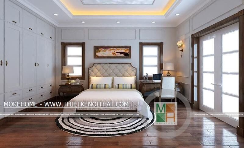 Hệ thống tủ quần áo và kệ tủ đều làm bằng gỗ sồi phun sơn trắng với những chi tiết góc cạnh tân cổ điển
